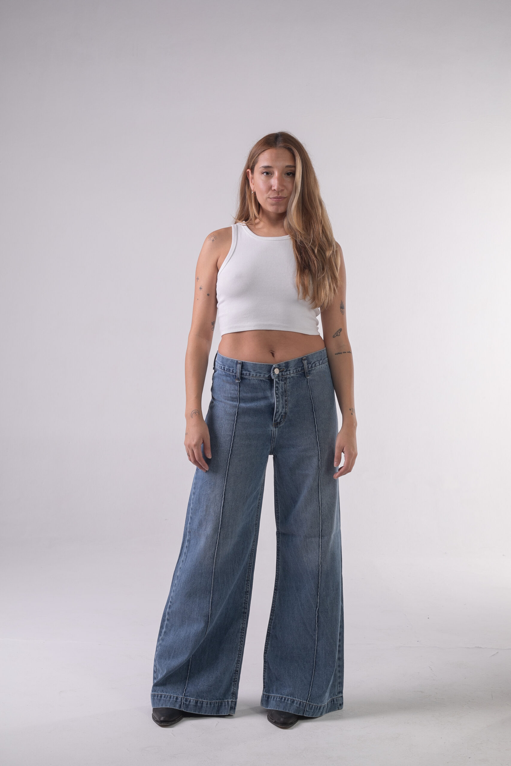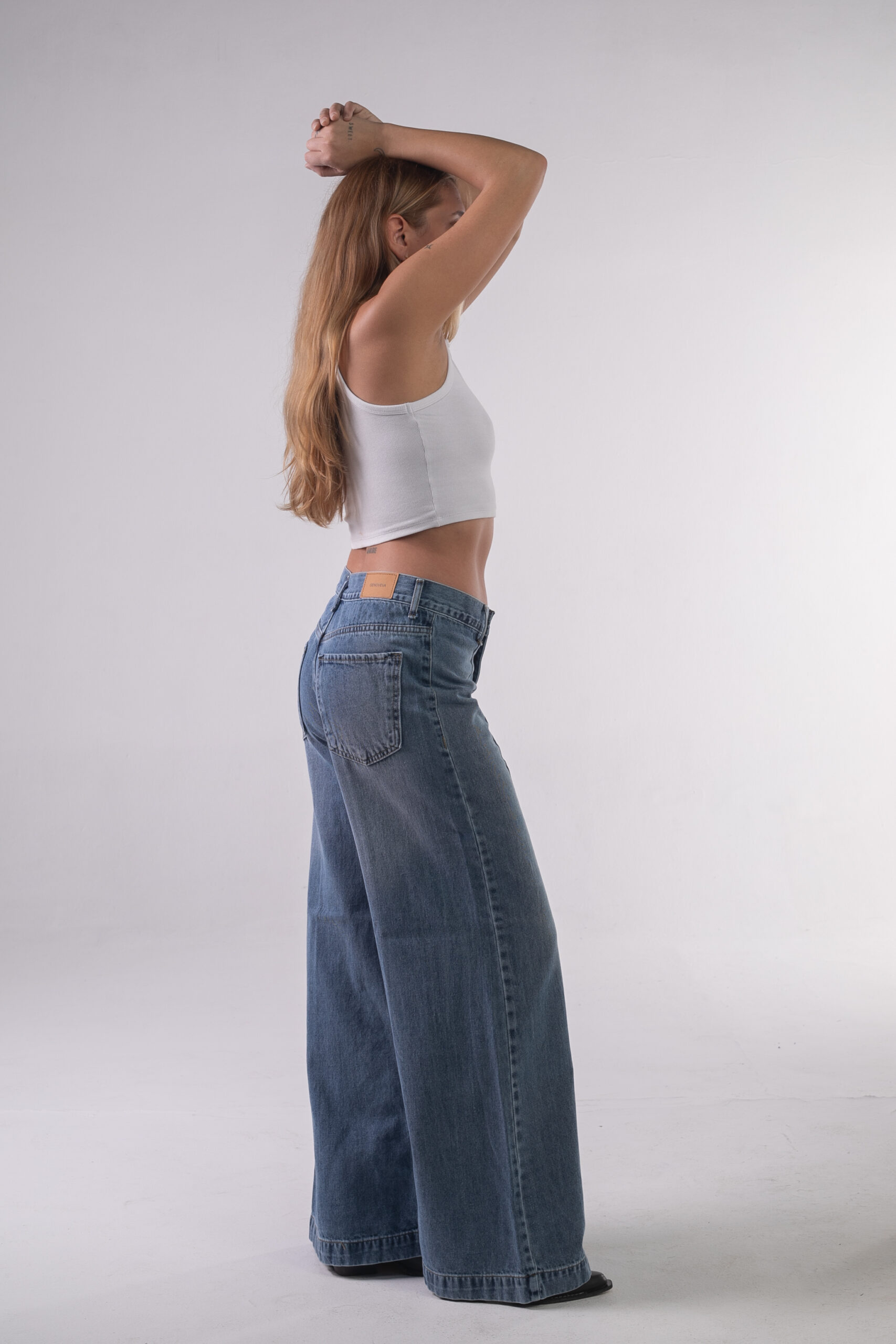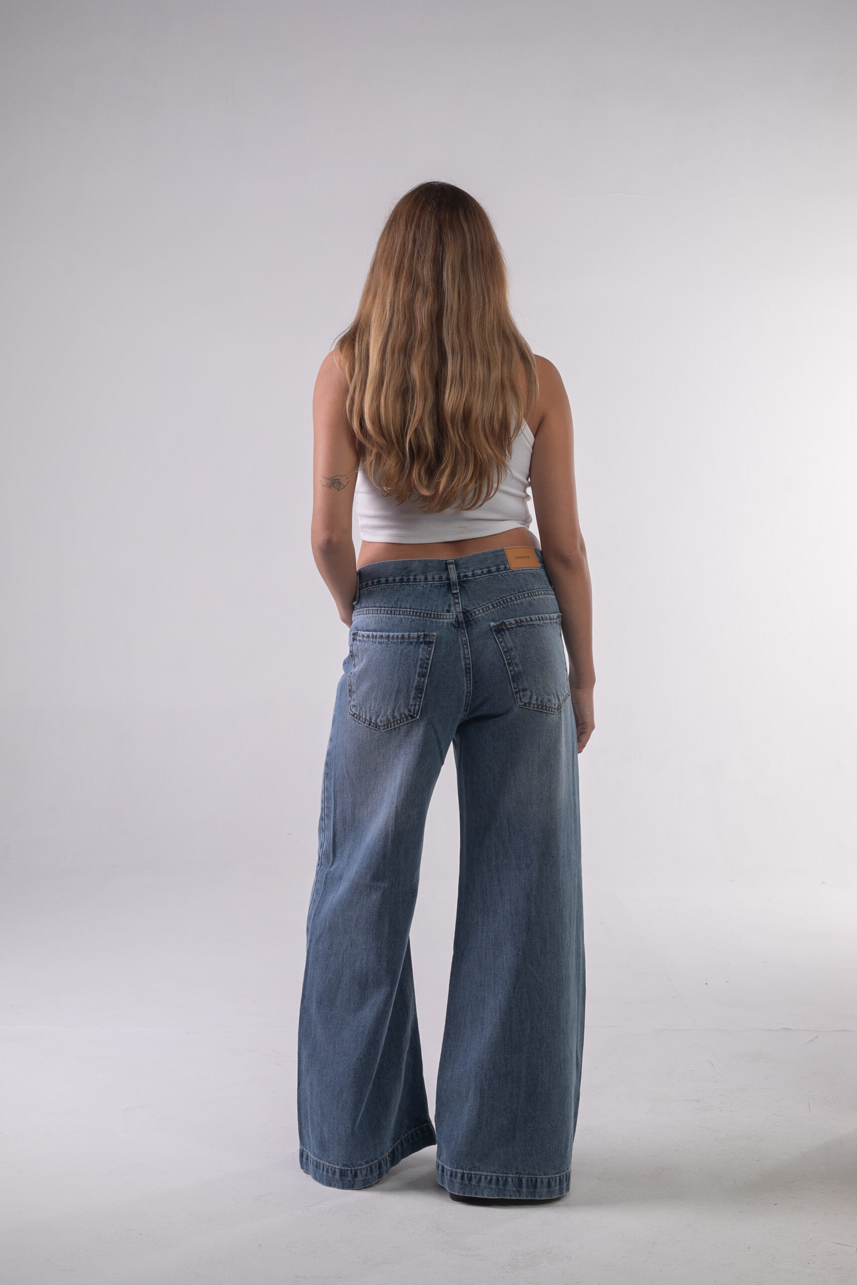 Jean rígido super ancho con detalle cola de rata en frente, azul stone