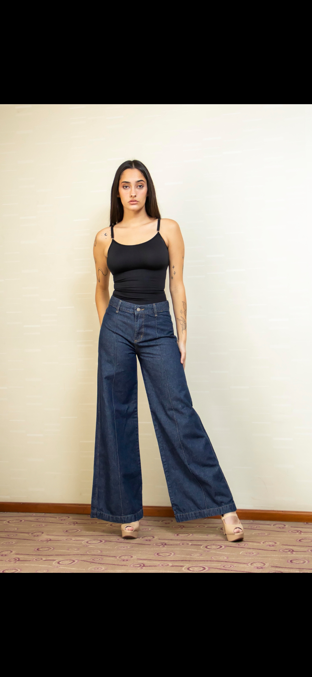 Jean rígido wide leg tiro medio alto c bastilla delantera, ruedo doble, azul oscuro