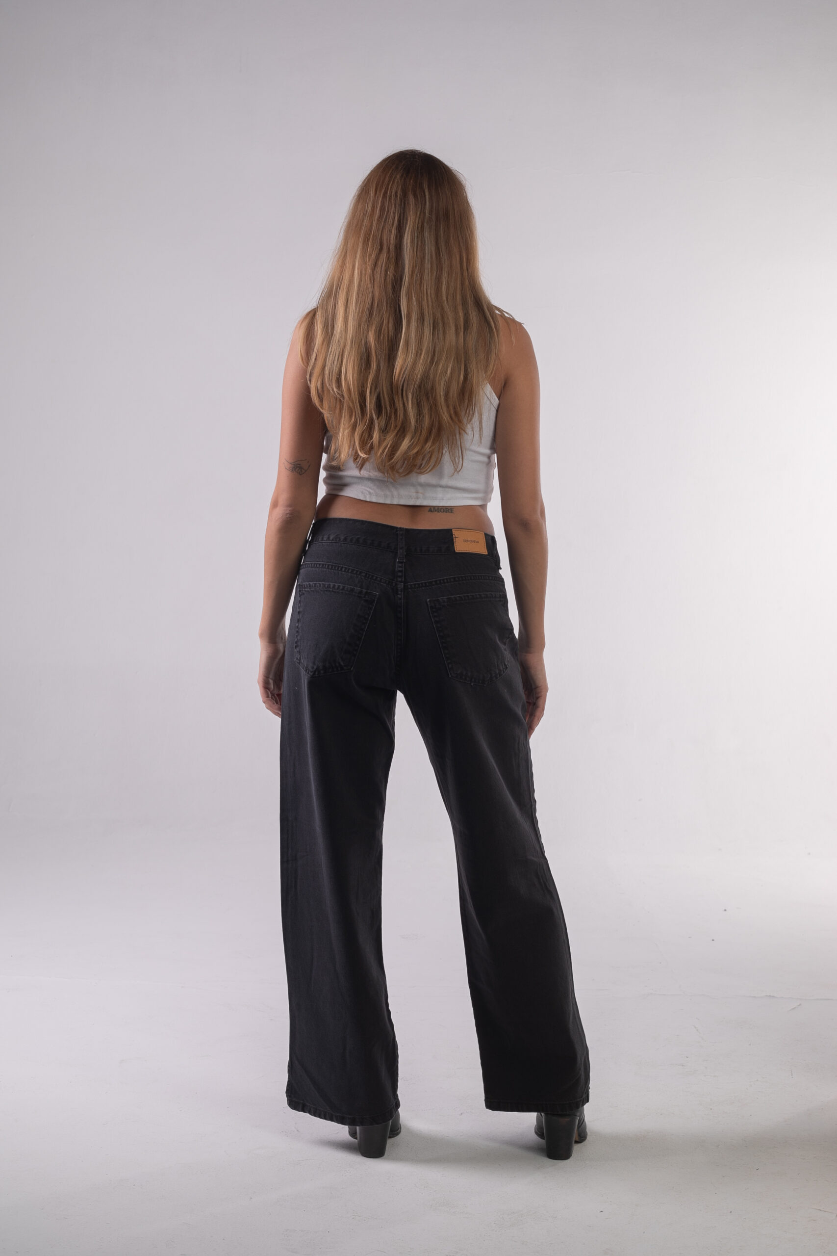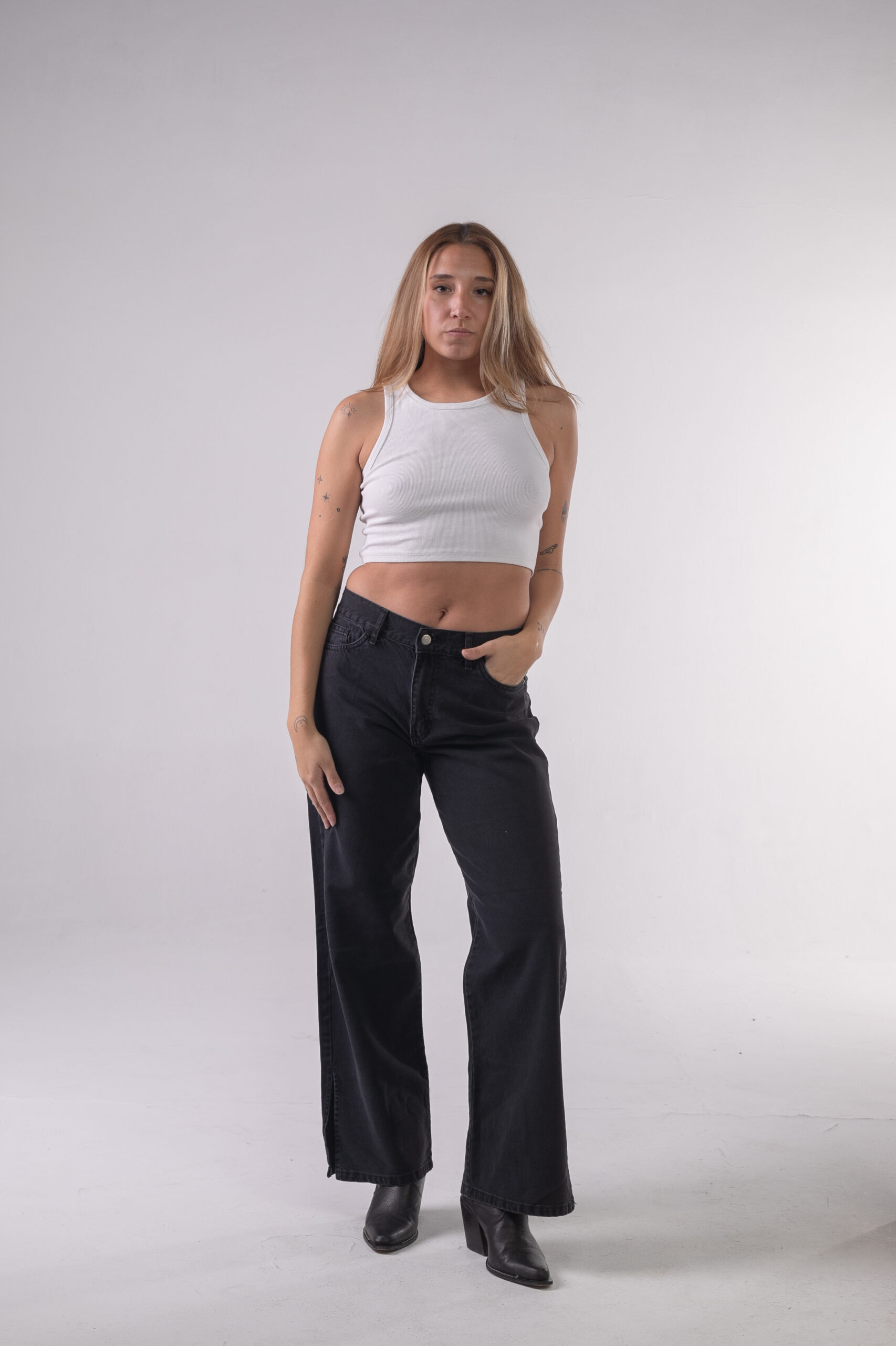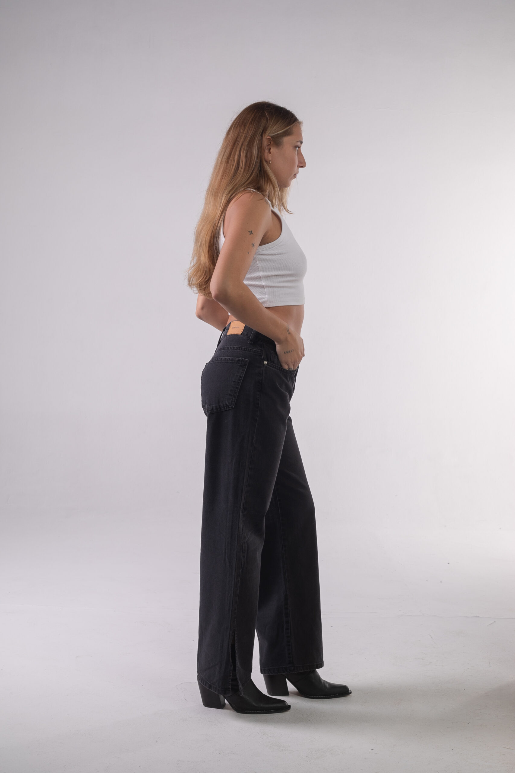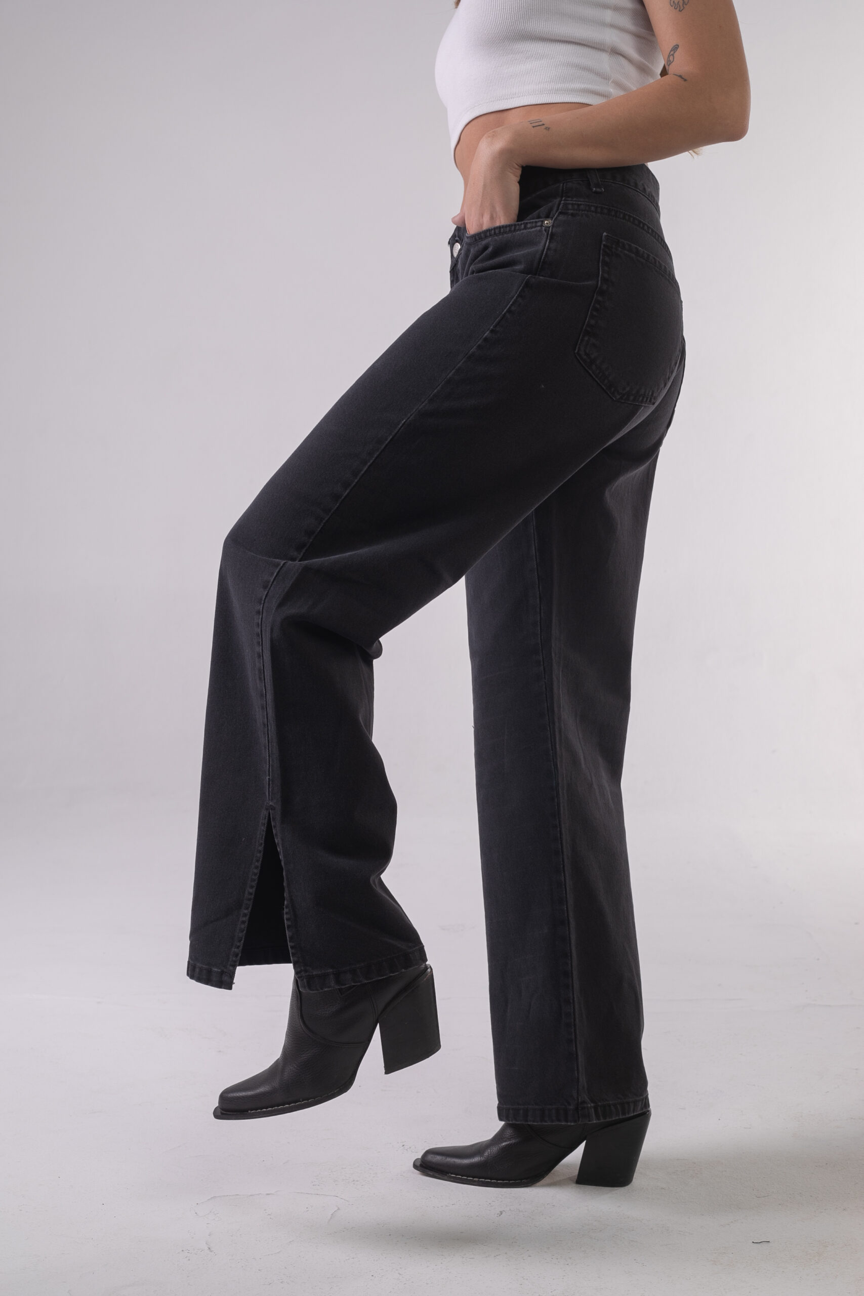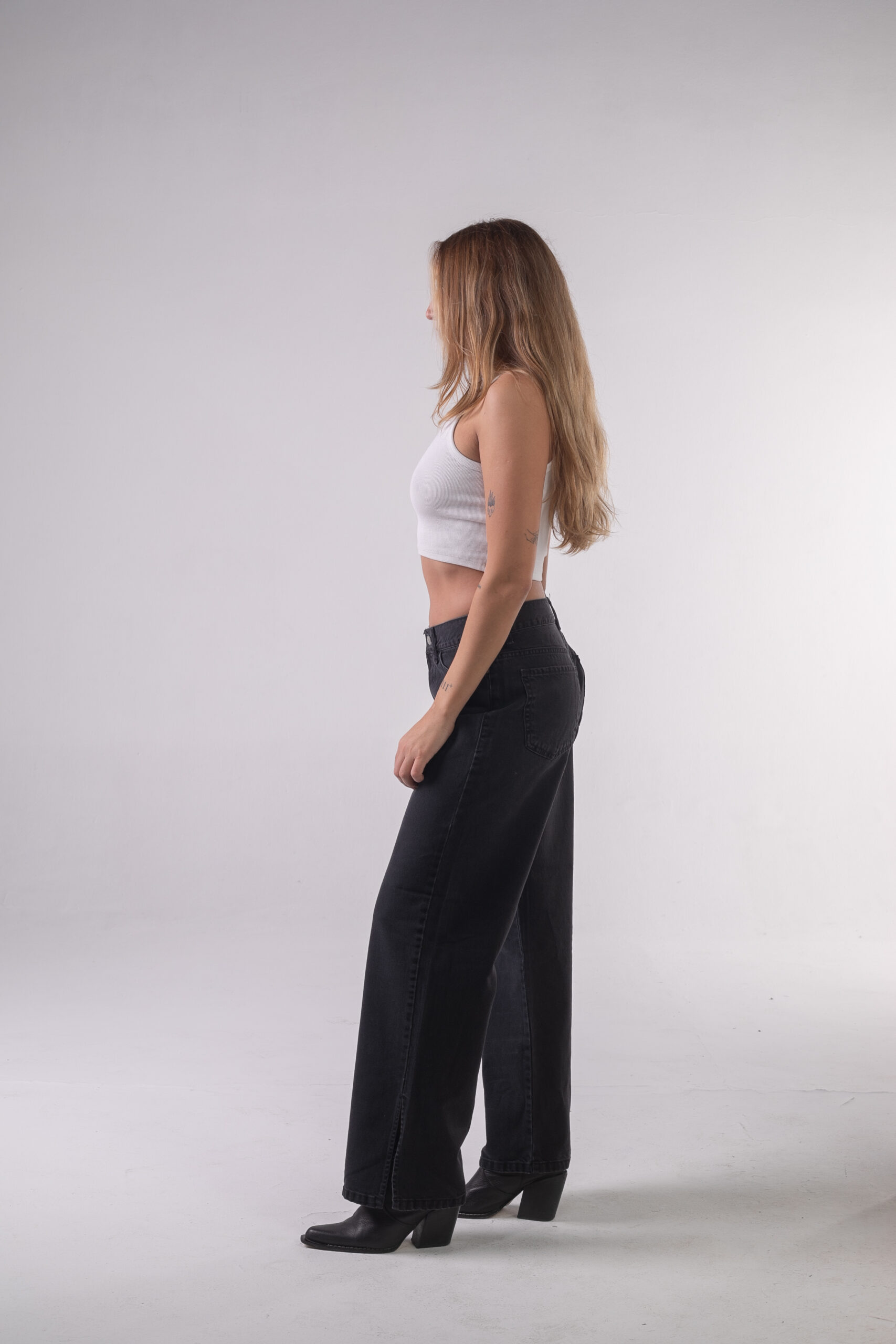 Jean rígido ancho pierna negro láser, con tajo en botamanga