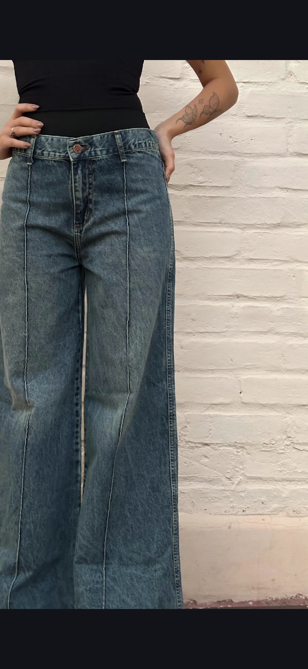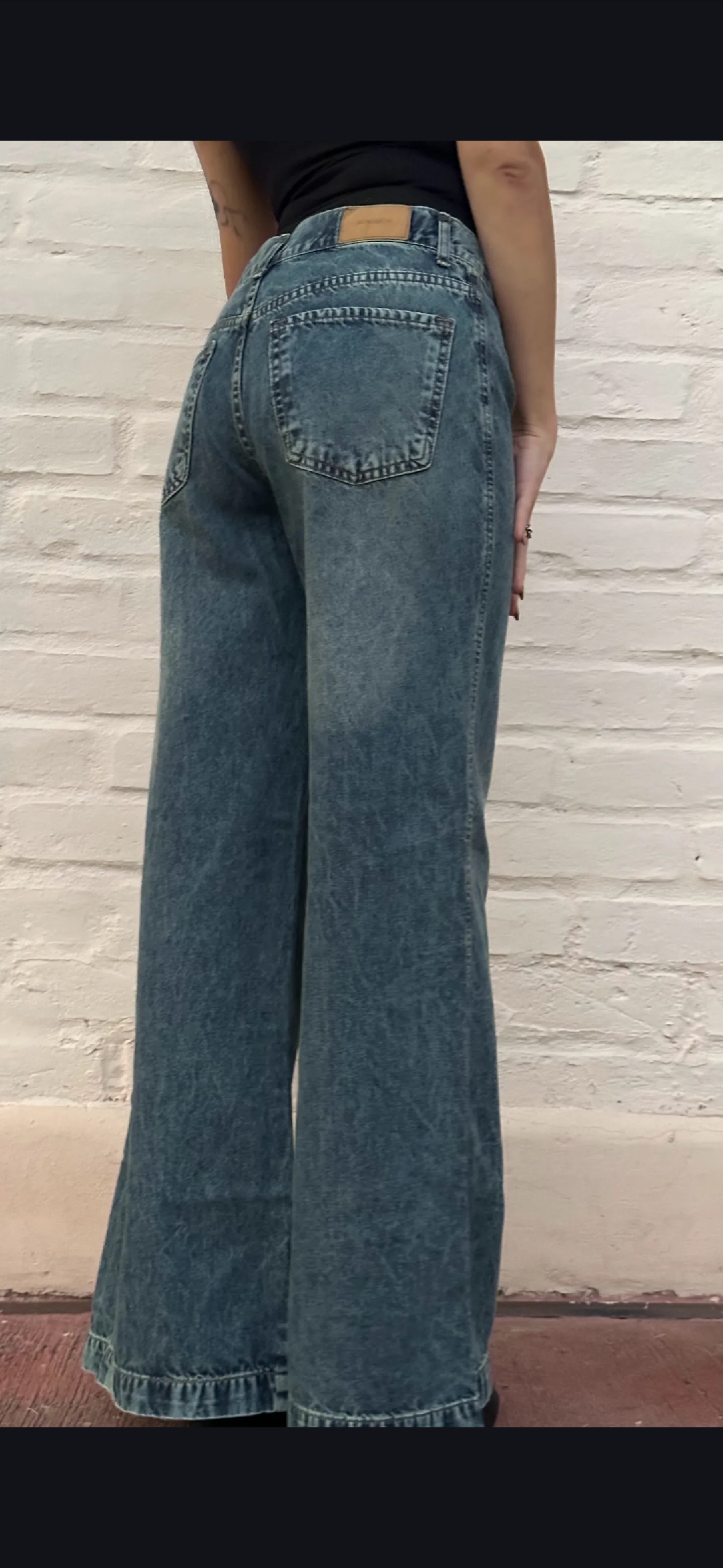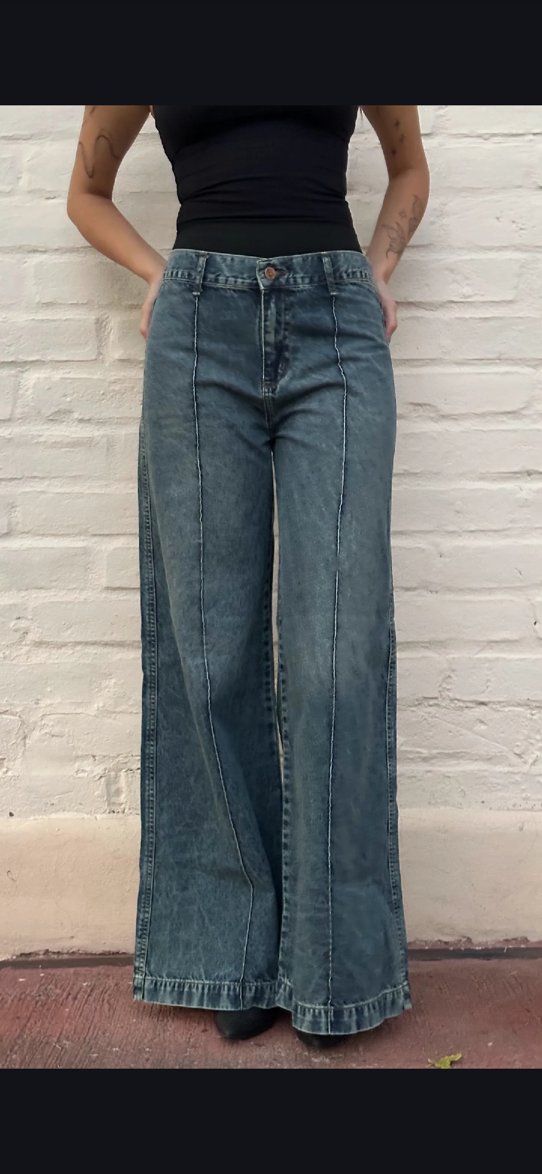 Jean rigido wide leg oxido con bastilla delantera, tiro medio, ruedo doble