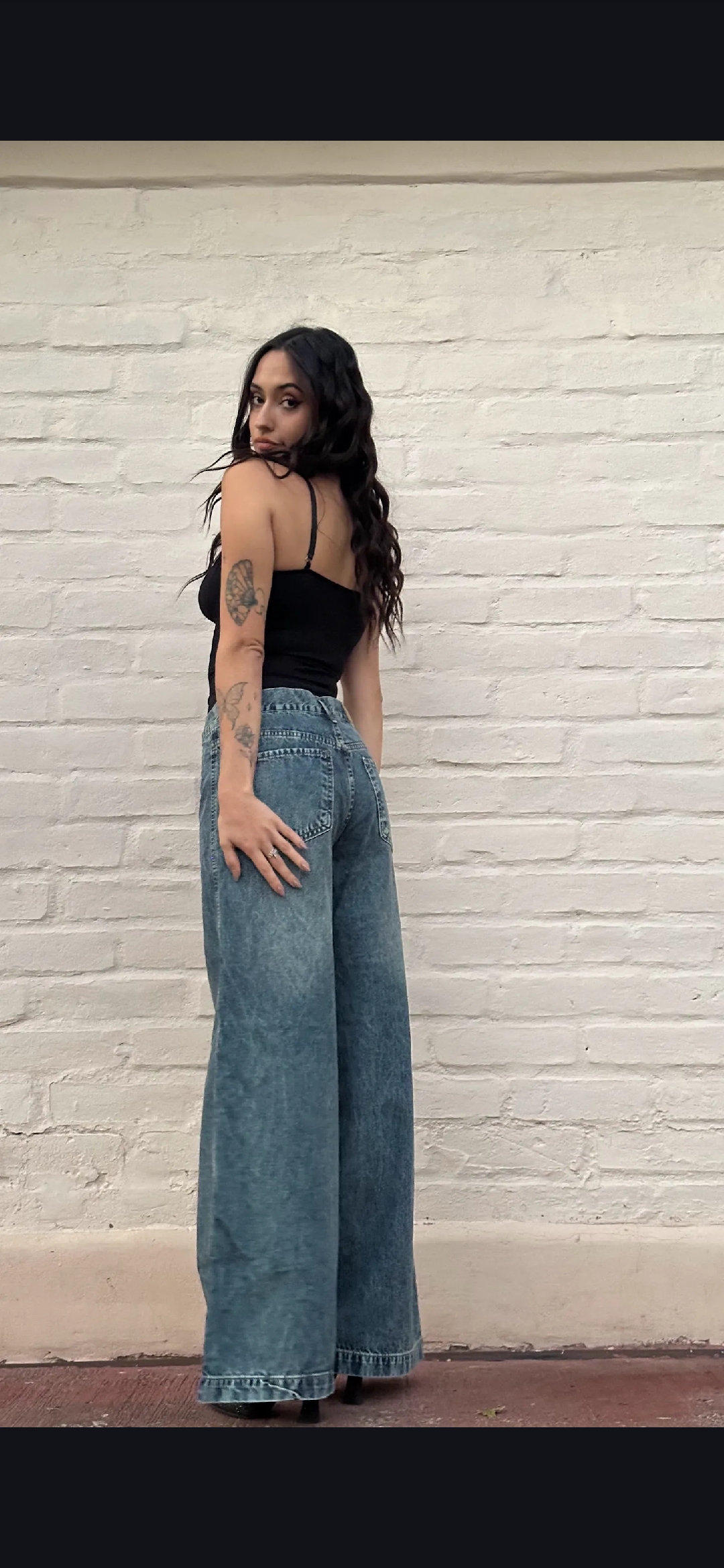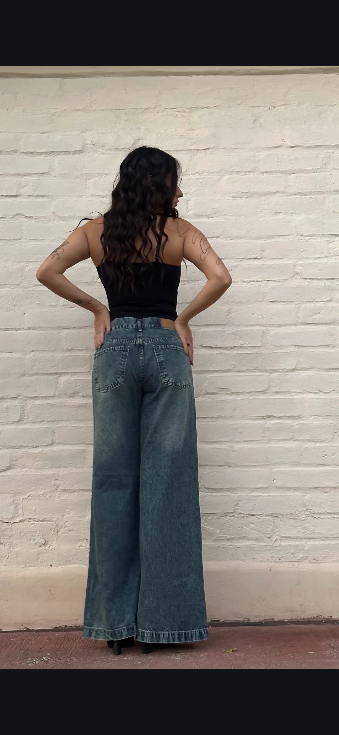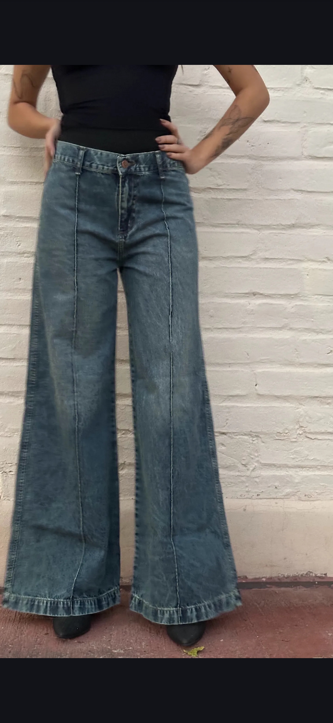 Jean rigido wide leg oxido con bastilla delantera, tiro medio, ruedo doble
